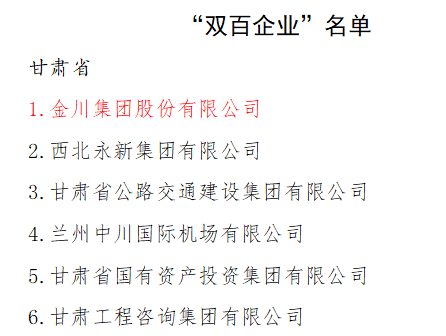 6月20日,國(guó)務(wù)院國(guó)有資產(chǎn)監(jiān)督管理委員會(huì)公布最新“雙百企業(yè)”名單,據(jù)名單顯示,金川集團(tuán)股份有限公司入選其中。