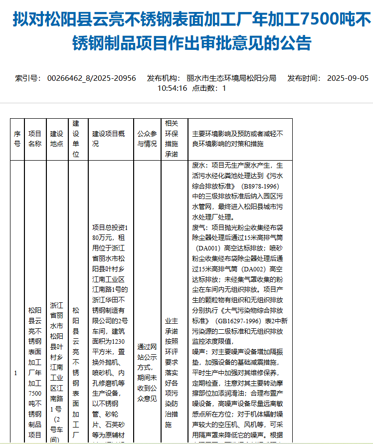 2025年9月5日,麗水市生態(tài)環(huán)境局松陽(yáng)分局?jǐn)M對(duì)松陽(yáng)縣云亮不銹鋼表面加工廠年加工7500噸不銹鋼制品項(xiàng)目環(huán)境影響評(píng)價(jià)報(bào)告表作出審批意見(jiàn)并對(duì)外進(jìn)行公告,公告期為:2025年9月5日至2025年9月11日(5個(gè)工作日)。